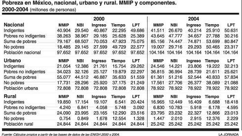 Entre 2000 Y 2004 la pobreza integrada (MMIP) en México pasó de 79.167 a 85.016 millones de personas, un aumentó de 5.850 millones que equivale a un aumento porcentual de 7.4%. Durante el mismo periodo, la población total del país aumentó en 6.506.000 de personas, la mayor parte de la cual se tradujo en crecimiento de la pobreza, ya que los no pobres aumentaron en sólo 657.000 personas. Esto significa que mientras la incidencia de la pobreza (proporción de pobres en la población nacional) en el año 2000 era de 81.07, la llamada incidencia marginal (el aumento del número de pobres dividido entre el aumento en la población) fue de 89.9% (9 de cada 10). Cuando la incidencia marginal es mayor que la incidencia inicial, la proporción de pobres crece. Así se llegó en 2004 a 81.62%.