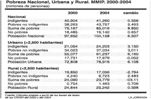 En pocas palabras, en el periodo 2000-2004 la pobreza en el país aumentó, lo que refuta la afirmación insistente del gobierno de Fox y del Banco Mundial de que la pobreza ha descendido fuertemente en el periodo. Cambiando la metodología y usando las mismas fuentes, las muy cuestionadas ENIGH, la tendencia resulta la opuesta. Veamos cuál fue el comportamiento del número de pobres en los medios urbano y rural.