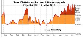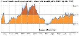 L’Italie et l’Espagne présentent des situations relativement contrastées. L’Espagne est aujourd’hui victime d’une crise majeure de liquidité et d’une crise bancaire sur fond de sévère récession économique avec un taux de chômage pratiquement égal au quart de la population active. L’Italie est, pour l’instant, épargnée par la crise de liquidité (même si elle connaît des difficultés croissantes à se refinancer sur les marchés financiers) mais elle est lestée par une très forte dette (120% du PIB), dont les intérêts pèsent lourdement sur son budget, et elle connaît depuis des années une croissance très faible. Ces facteurs ont conduit à mettre en doute sa solvabilité à long terme et déclenchent une crise de liquidité similaire à celle que l’Espagne connaît. Les taux d’intérêts des emprunts d’état à 10 ans, ont connu ces dernières années une évolution symétrique.