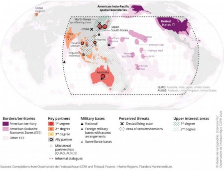[17] Élaborée depuis 2011 et développée par les administrations étasunienne successives jusqu’à nos jours, cette stratégie définit un cadre global plaçant l’Indo-Pacifique au cœur de la sécurité, de l’hégémonie et de la défense des États-Unis. Ces concepts stratégiques sont formalisés dans des documents tels que la US Indo-Pacific Strategy.