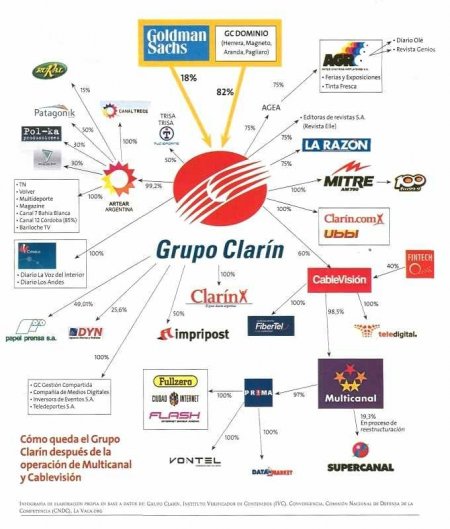 A titre d’exemple, le Groupe Clarin couvre 41,88 % de la population sur les radios AM-FM et 38,78% sur la TV « ouverte », avec 25 fréquences. Il couvre 58,61% du marché de TV par câble avec 237 fréquences. Le Groupe Unos couvre 37,6% en radio AM- FM et 37,5 % sur la télévision « ouverte » et possède 28 licences. Sur la TV par câble il possède 49 licences. Le groupe Cadena Tres couvre 40, 92 % avec la radio AM-FM ; le Groupe Prisa pour sa part 42,94% .