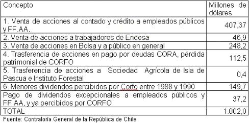 Durante el período 1985 a marzo de 1990, la privatización de 32 empresas y activos del Estado; la fijación de precios inferiores a los de mercado (en varios casos sin licitación pública); los créditos subsidiados para comprar acciones; la irrecuperabilidad de muchos préstamos concedidos para el mismo fin; las deudas de las empresas enajenadas y que debió asumir Corfo (sólo los intereses generados por éstas sumaban unos U$S 500 millones); el desvío de este ingreso a fondos generales de la Nación, arrojó al Estado una pérdida estimada en U$S 2.209 millones.