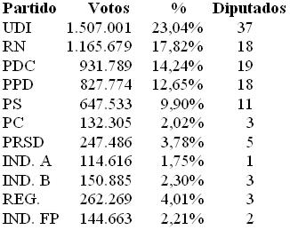 El sistema binominal de elecciones permite sacar más diputados con menos votos. También permite que pierdan candidatos que sacaron más votos, como el caso de Álvaro Escobar (ME-O) que fue "derrotado" por José Auth, presidente del PPD. Al renovarse sólo la mitad del Senado, la Concertación mantuvo allí su mayoría, con 19 miembros, frente a 16 de la derecha. Siguen los independientes cuyas circunscripciones no se renovaron : Carlos Bianchi, que suele votar con la derecha ; Carlos Cantero, ex RN, y Alejandro Navarro, ex PS.