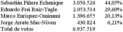 Como estaba previsto en las encuestas, el derechista Sebastián Piñera obtuvo la primera mayoría relativa en la elección presidencial del domingo, con el 44,05% de los votos, según el último escrutinio oficial que cubre el 99,46% de la votación nacional.
